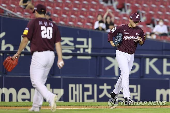 (서울=연합뉴스) 서대연 기자 = 18일 서울 송파구 잠실야구장에서 열린 2022 프로야구 KBO리그 키움 히어로즈와 두산 베어스의 경기. 7회말 키움 이승호가 선발투수 최원태와 교체돼 마운드에 오르고 있다. 2022.8.18