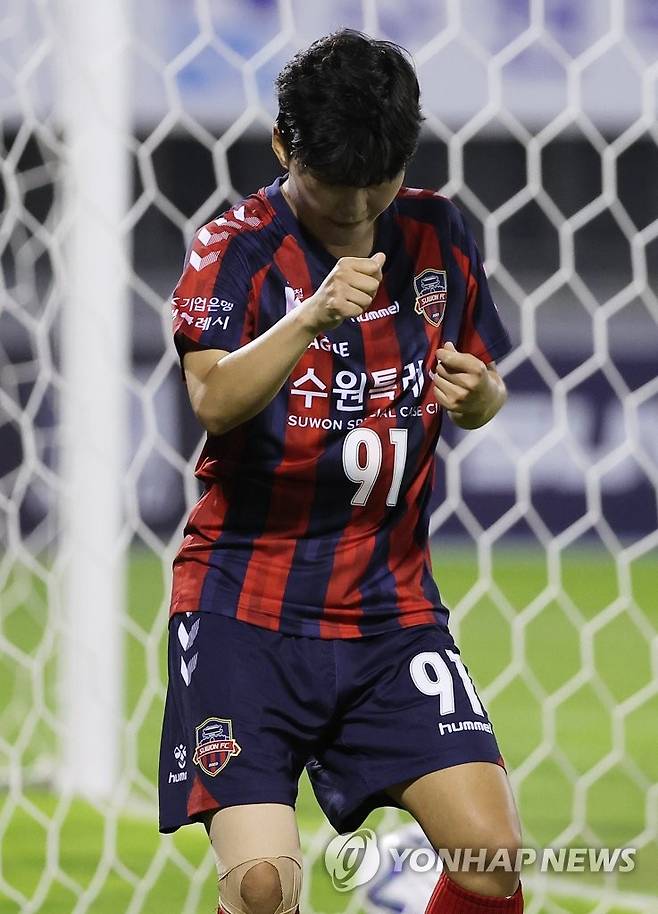 (수원=연합뉴스) 홍기원 기자 = 18일 경기도 수원종합운동장에서 열린 WK리그 수원FC 위민과 보은 상무의 경기. 골을 넣은 수원FC 위민 지소연이 기뻐하고 있다. 2022.8.18
