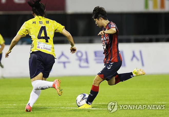 (수원=연합뉴스) 홍기원 기자 = 18일 경기도 수원종합운동장에서 열린 WK리그 수원FC 위민과 보은 상무의 경기. 수원FC 위민 지소연이 자신의 두 번째 골을 넣고 있다. 2022.8.18
