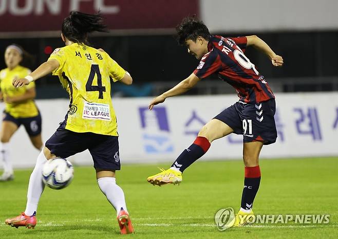 (수원=연합뉴스) 홍기원 기자 = 18일 경기도 수원종합운동장에서 열린 WK리그 수원FC 위민과 보은 상무의 경기. 수원FC 위민 지소연이 자신의 두 번째 골을 넣고 있다. 2022.8.18