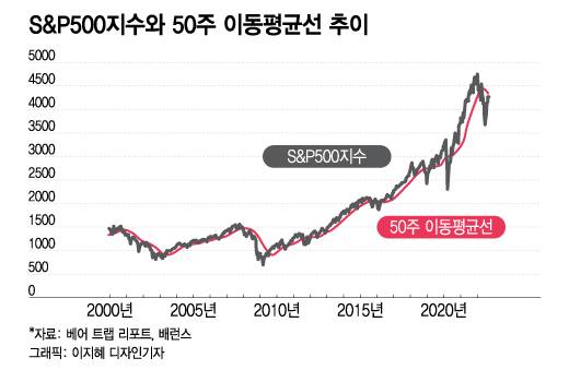예를들어 2020년 코로나 팬데믹 침체장 때 S&P500지수는 몇 개월간 50주 이동평균선 밑에 머물다 상향 돌파에 성공했다. 2000년 닷컴 버블 붕괴로 인한 침체장에서는 여러 차례 증시가 급반등했지만 한번도 50주 이동평균선을 넘어서지 못했고 2003년이 돼서야 50주 이동평균선을 회복하면서 침체장이 끝났다.