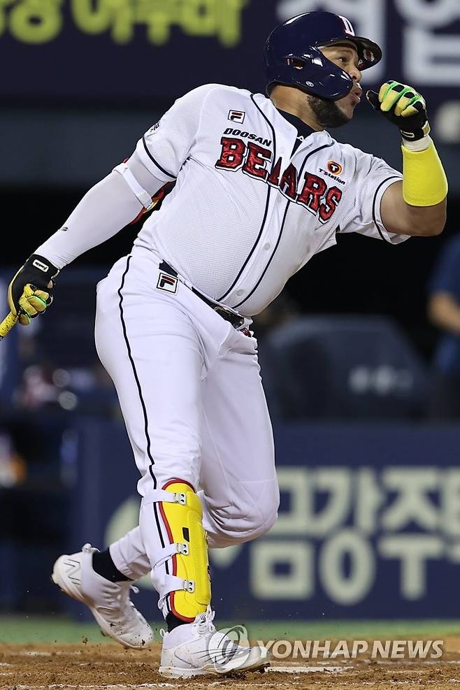(서울=연합뉴스) 서대연 기자 = 18일 서울 송파구 잠실야구장에서 열린 2022 프로야구 KBO리그 키움 히어로즈와 두산 베어스의 경기. 7회말 2사 만루 두산 페르난데스가 3타점 2루타를 치고 있다. 2022.8.18