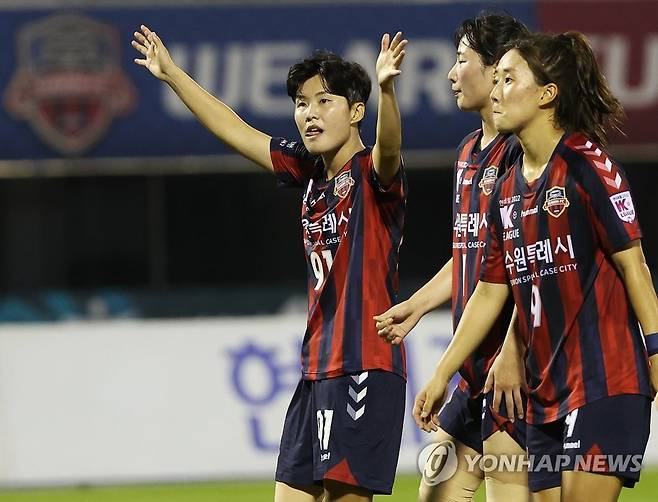 (수원=연합뉴스) 홍기원 기자 = 18일 경기도 수원종합운동장에서 열린 WK리그 수원FC 위민과 보은 상무의 경기. 수원FC 위민 지소연이 경기가 끝난 후 팬들에게 인사하고 있다. 2022.8.18