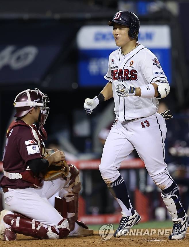 (서울=연합뉴스) 서대연 기자 = 18일 서울 송파구 잠실야구장에서 열린 2022 프로야구 KBO리그 키움 히어로즈와 두산 베어스의 경기. 7회말 2사 2루 두산 허경민이 2점 홈런을 치고 세리머니를 하고 있다. 2022.8.18