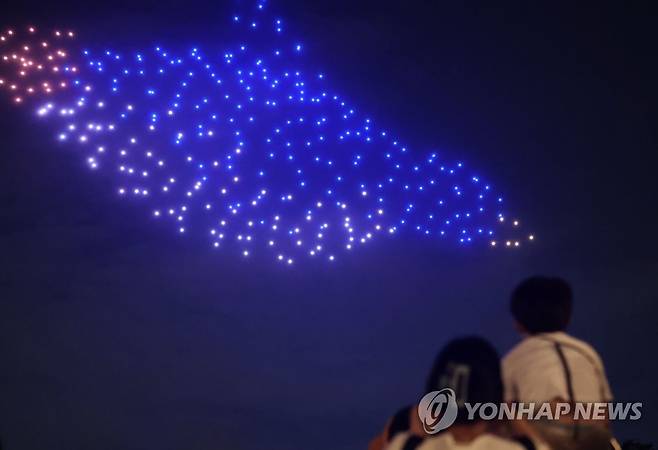 (서울=연합뉴스) 류영석 기자 = 18일 오후 서울 성동구 서울숲에서 국제환경단체 그린피스의 해양보호 드론쇼가 펼쳐지고 있다. 2022.8.18
