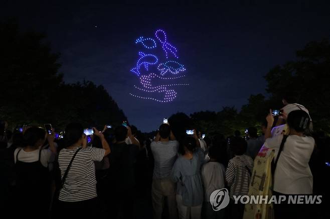 (서울=연합뉴스) 류영석 기자 = 18일 오후 서울 성동구 서울숲에서 국제환경단체 그린피스의 해양보호 드론쇼가 펼쳐지고 있다. 2022.8.18