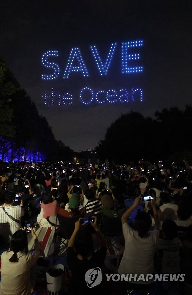 (서울=연합뉴스) 류영석 기자 = 18일 오후 서울 성동구 서울숲에서 국제환경단체 그린피스의 해양보호 드론쇼가 펼쳐지고 있다. 2022.8.18