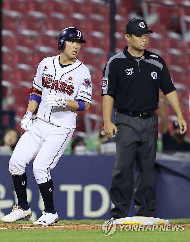 (서울=연합뉴스) 서대연 기자 = 18일 서울 송파구 잠실야구장에서 열린 2022 프로야구 KBO리그 키움 히어로즈와 두산 베어스의 경기. 8회말 1사 주자 없는 상황 두산 정수빈이 3루타를 치고 3루에 안착하고 있다. 2022.8.18