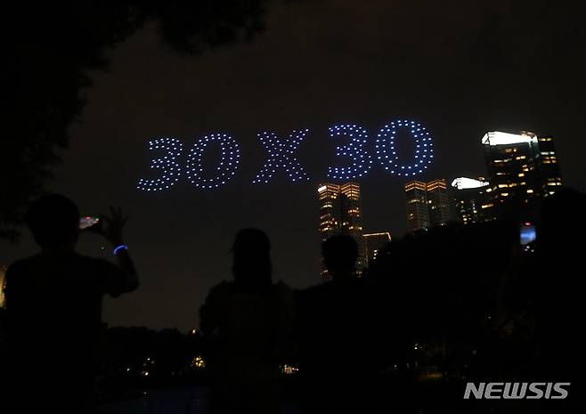 도심 하늘 수놓은 드론쇼 '30X30 캠페인은요..'