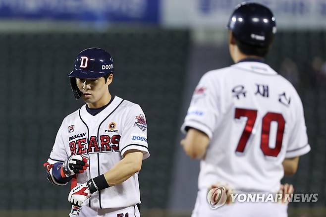 (서울=연합뉴스) 서대연 기자 = 18일 서울 송파구 잠실야구장에서 열린 2022 프로야구 KBO리그 키움 히어로즈와 두산 베어스의 경기. 8회말 1사 1, 3루 두산 조수행이 1타점 안타를 치고 1루에 안착하고 있다. 2022.8.18