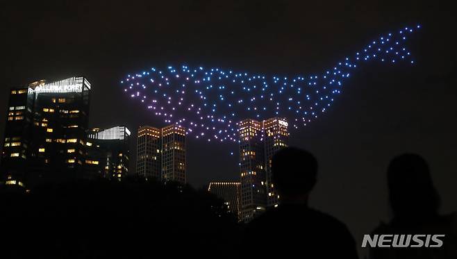 [서울=뉴시스] 조수정 기자 = 그린피스 주최 '기후위기 해결사 바다를 지키는 해양보호 드론쇼'가 진행된 18일 오후 서울숲공원에서 드론 400여대가 날아오르며 고래 등 바다동물이 헤엄치는 장면을 연출하고 있다. 2022.08.18. chocrystal@newsis.com