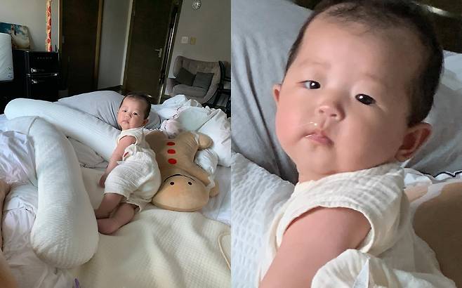 침대에 뒹굴거리는 모습부터 콧물을 흘리고 있는 클로즈업 사진까지 둘째 딸의 깜찍한 일상 모습이 랜선 이모, 삼촌들의 미소를 자아낸다.