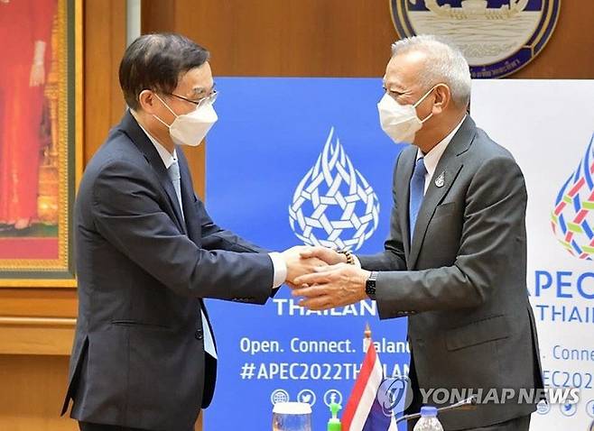 (서울=연합뉴스) 제11차 아시아태평양경제협력체(APEC) 관광장관회의 참석을 위해 태국 방콕을 방문 중인 조용만 문화체육관광부 제2차관이 18일 태국 관광체육부 청사에서 피팟 랏차낏쁘라깐 관광체육부 장관을 만나 인사를 나누고 있다. 2022.8.18 [문화체육관광부 제공. 재판매 및 DB금지]
