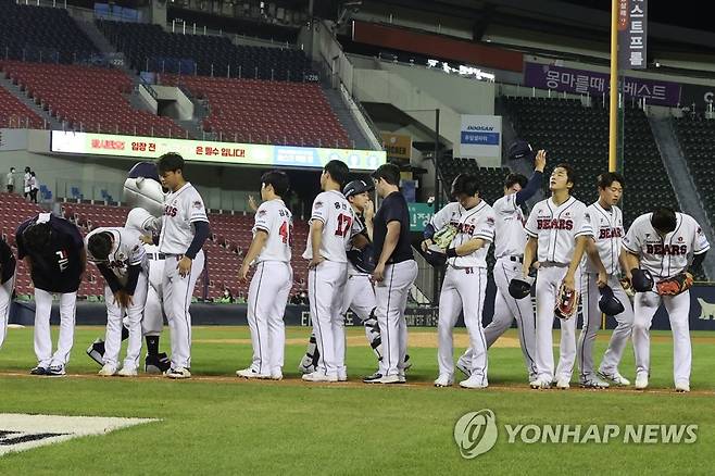 (서울=연합뉴스) 서대연 기자 = 18일 서울 송파구 잠실야구장에서 열린 2022 프로야구 KBO리그 키움 히어로즈와 두산 베어스의 경기. 10-2로 대승을 거둔 두산 선수들이 자축하고 있다. 2022.8.18