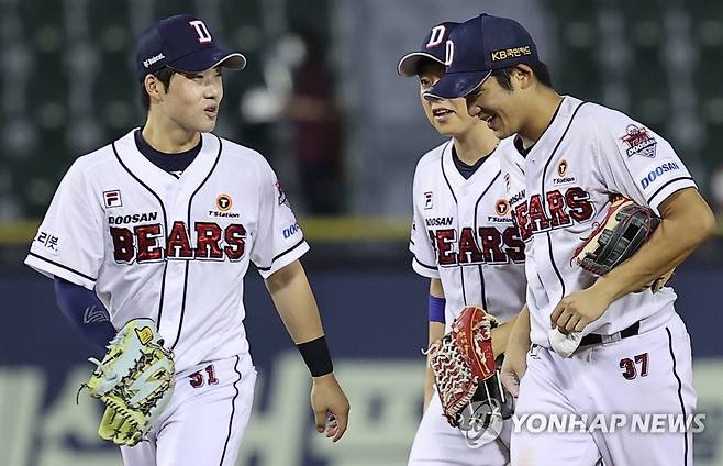 (서울=연합뉴스) 서대연 기자 = 18일 서울 송파구 잠실야구장에서 열린 2022 프로야구 KBO리그 키움 히어로즈와 두산 베어스의 경기. 10-2로 대승을 거둔 두산 선수들이 자축하고 있다. 2022.8.18
