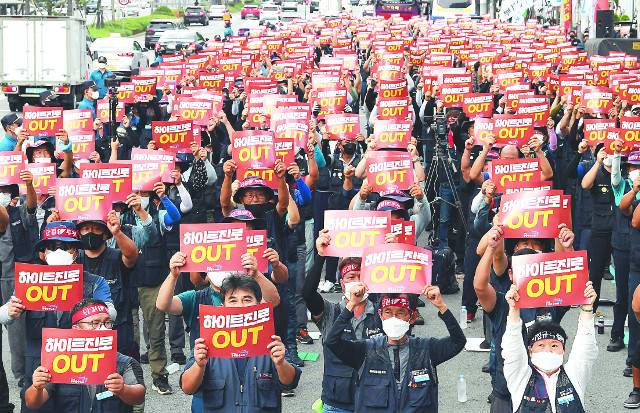 민주노총 공공운수노조 화물연대 조합원들이 18일 서울 강남구 하이트진로 본사 앞에서 열린 결의대회에서 구호를 외치고 있다. 화물연대는 지난 16일부터 하이트진로 본사 1층과 옥상에서 해고자 복직, 손해배상 소송 철회 등을 요구하며 농성을 벌이고 있다.