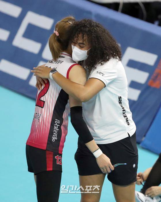 '2022 순천·도드람컵 프로배구대회' 한국도로공사와 KGC인삼공사의 경기가 18일 오후 전남 순천 팔마체육관에서 열렸다. 도로공사가 세트 스코어 3-1(23-25 25-20 26-24 25-21)로 승리하고 준결승에 진출했다. 경기종료후 패한 인삼공사 한송이를 외국인 선수 엘리자벳이 포옹하고있다.