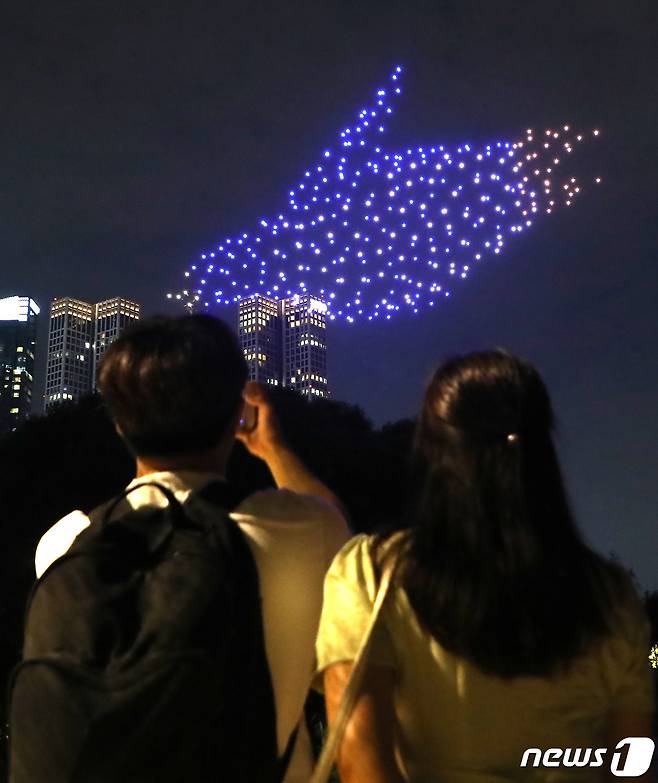 그린피스는 드론쇼를 통해 고래와 바다거북이 등 멸종위기에 처한 동물과 바다를 구하기 위한 메시지를 표현했다. 2022.8.18/뉴스1