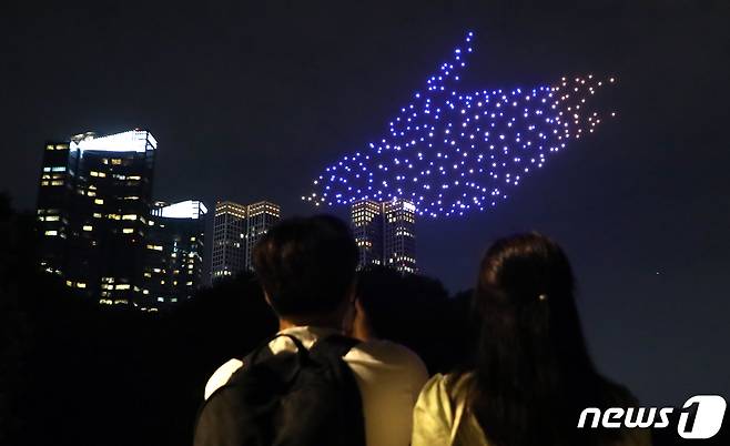 (서울=뉴스1) 장수영 기자 = 18일 서울 성동구 서울숲에서 그린피스가 개최한 해양보호 드론쇼 중 300대의 드론으로 만들어진 펭귄이 도심 위로 헤엄 치고 있다.