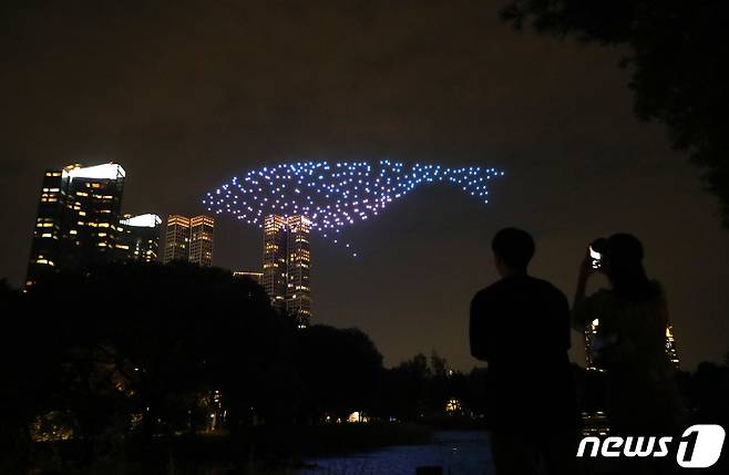 (서울=뉴스1) 장수영 기자 = 18일 서울 성동구 서울숲에서 그린피스가 개최한 해양보호 드론쇼 중 300대의 드론으로 만들어진 고래가 도심 위로 헤엄 치고 있다.
