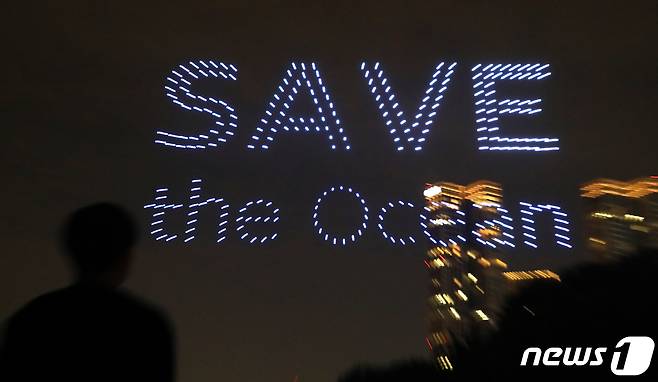 (서울=뉴스1) 장수영 기자 = 18일 서울 성동구 서울숲에서 그린피스가 개최한 해양보호 드론쇼 중 300대의 드론이 해양 보호 캠페인 문구를 만들고 있다.