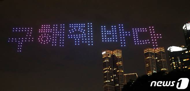(서울=뉴스1) 장수영 기자 = 18일 서울 성동구 서울숲에서 그린피스가 개최한 해양보호 드론쇼 중 300대의 드론이 해양 보호 캠페인 문구를 만들고 있다.