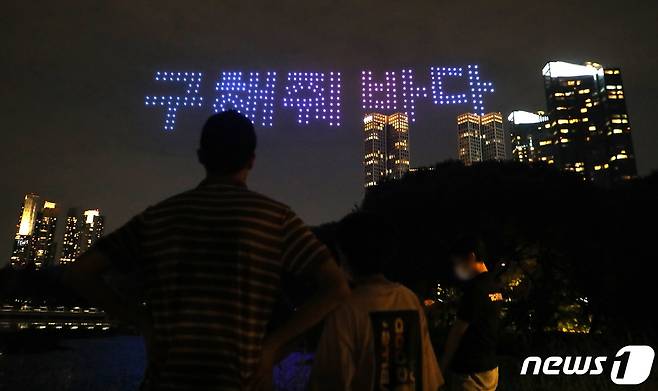 그린피스는 드론쇼를 통해 고래와 바다거북이 등 멸종위기에 처한 동물과 바다를 구하기 위한 메시지를 표현했다. 사진은 촬영 후 좌우반전. 2022.8.18/뉴스1