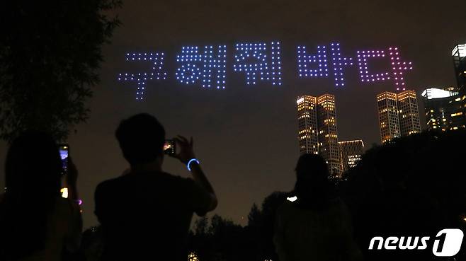 (서울=뉴스1) 장수영 기자 = 18일 서울 성동구 서울숲에서 그린피스가 개최한 해양보호 드론쇼 중 300대의 드론이 해양 보호 캠페인 문구를 만들고 있다.