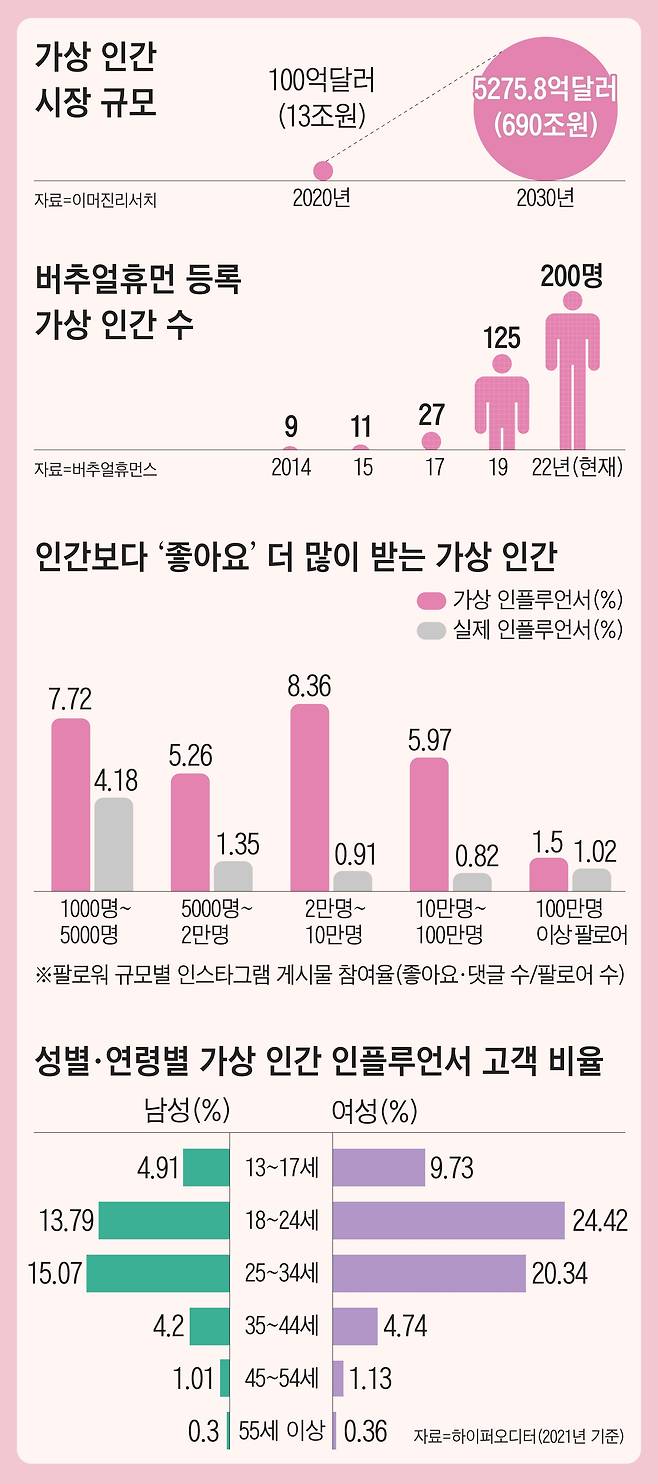 사람 얼굴이나 목소리, 신체의 일부나 전부를 컴퓨터 그래픽 기술을 통해 만든 가상 인간 열풍이 한국에서 유독 거세다. 관련 업계에 따르면 현재 우리나라에서 탄생해 활동하는 가상 인간 수는 150여 명. 가상 인간을 만들어 관리하는 데 수십억원을 쓰거나 전담 조직까지 만든 기업들도 있다. 가상 인간이 TV광고나 소셜미디어에서 모델로 활동하는 것은 기본, 아이돌 가수 또는 배우로 활동하거나 TV 생방송 뉴스에 출연해 인터뷰까지 한다. 미국의 CNN은 ‘가상 인간(인플루언서)이 떠오르는 한국’이라는 제목의 기사에서 “가상 인플루언서들이 팬덤을 형성하는 데 그치지 않고 수익성 있는 산업으로 떠오르고 있다”고 전했다. 가상 인간 열풍은 어디서 왔고, 어디까지 갈까.