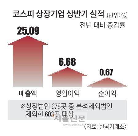 삼성전자를 제외한 상장기업의 상반기 매출액은 1년 전보다 25.77%, 영업이익은 12.96% 늘었다.
