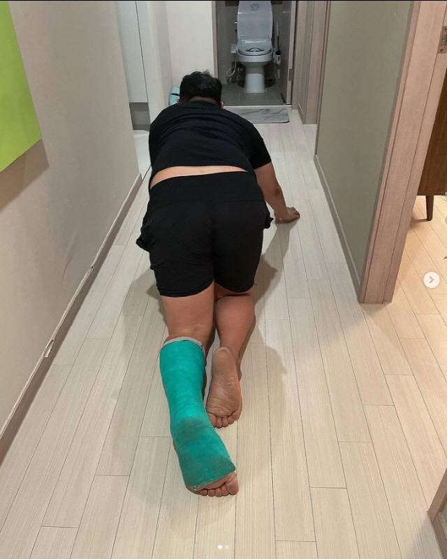 사진 속에는 아킬레스건 부상을 당해 깁스를 하고 있는 조지환이 거실을 기어다니고 있는 모습. 이 모습을 본 박혜민은 '바다코끼리'라며 대놓고 디스하는 모습을 보여 웃음을 자아냈다.