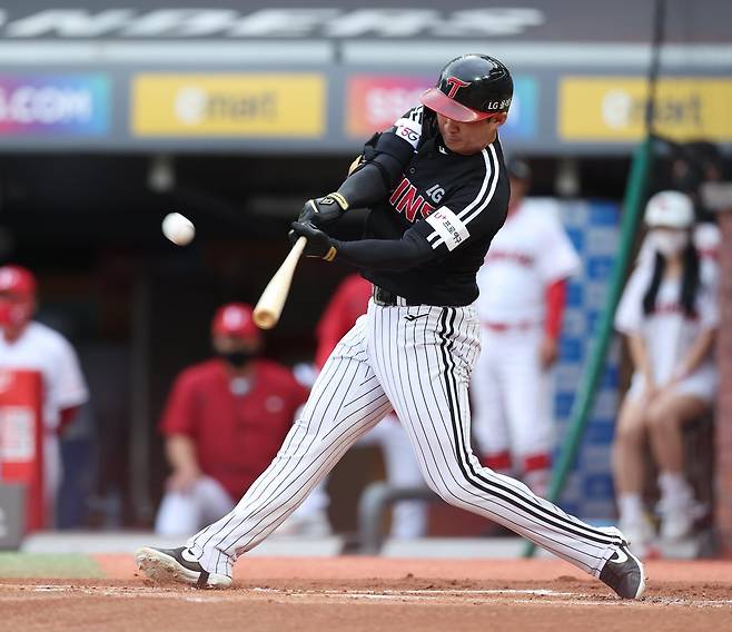 (서울=연합뉴스) 18일 오후 인천 SSG랜더스필드에서 열린 프로야구 LG와 SSG의 경기. LG 오지환이 시즌 20호 홈런을 날리고 있다. 2022.8.18 [LG 트윈스 제공. 재판매 및 DB 금지]