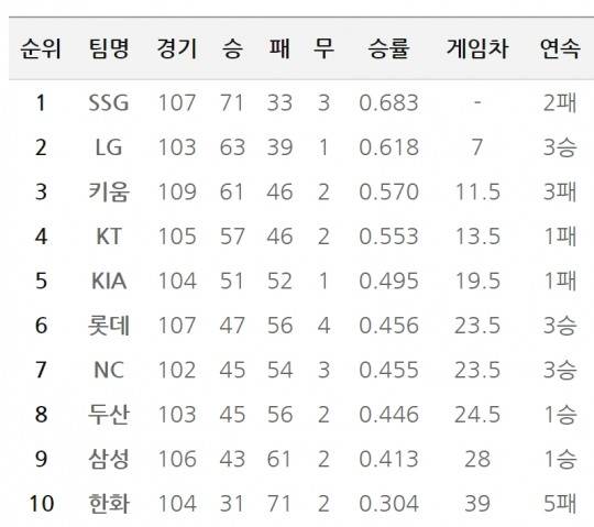 [18일 팀 순위]LG, 선두 SSG 잡아 7게임차 줄이고 3위 키움에는 4.5게임차 늘이고..롯데와 NC, 3연승하며 5위 KIA에 4게임차로 다가서
