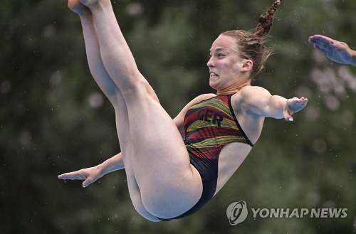 epa10127428 Tina Putzel of Germany in action during the Women Synchronised 3m Springboard final at the LEN European Aquatics Championships in Rome, Italy, 18 August 2022. EPA/RICCARDO ANTIMIANI