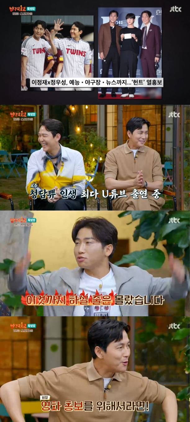 18일 방송된 JTBC 예능 프로그램 '방구석 1열 특별판, 작전명 '헌트' : 스포자들'(이하 '방구석 1열')에 영화 '헌트'의 주역 이정재, 정우성과 제작사 대표 한재덕이 출연했다.