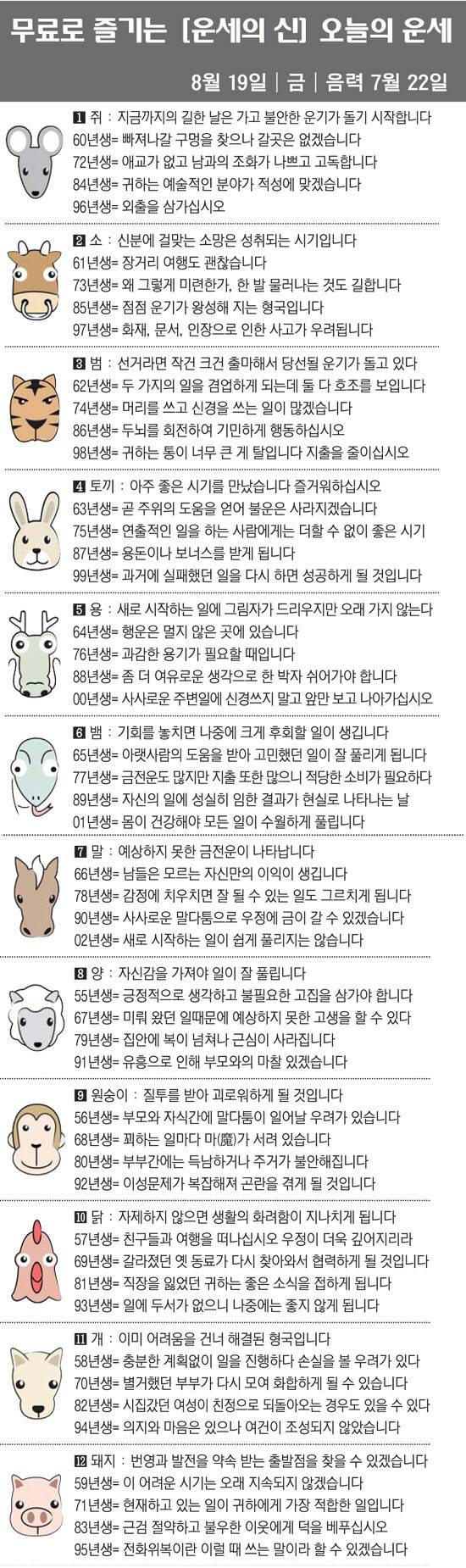 스포츠조선에서 제공하는 8월 19일(음력 7월 22일) 오늘의 운세입니다.