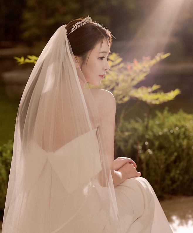 사진 속 이윤지는 웨딩드레스를 입고 순백의 미모를 자랑했다.