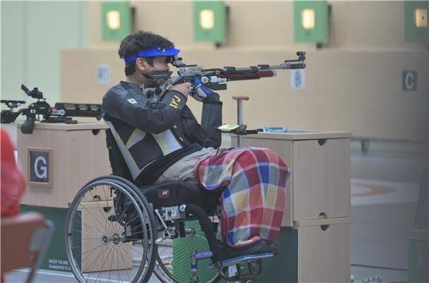 (서울=연합뉴스) 장애인사격국가대표 심영집이 18일 창원국제사격장에서 열린 2022 창원장애인사격장애인월드컵 대회 R1 10m 공기소총 남자 결선에서 조준하고 있다. 심영집은 이날 249.7점을 얻어 금메달을 차지했다. 2022.8.19 [대한장애인사격연맹 제공. 재판매 및 DB 금지]