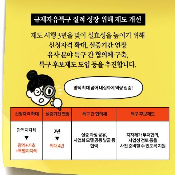 제도 시행 3년을 맞아 실효성을 높이기 위해 신청 자격 확대, 실증 기간 연장, 유사 분야 특구 간 협의체 구축, 특구 후보 제도 도입 등을 추진합니다.