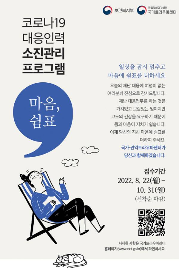 대상은 코로나19에 대응하는 의료진·소방·심리지원업무·행정업무 담당자 등으로, 오는 22일부터 국가트라우마센터 누리집(https://www.nct.go.kr)에서 선착순으로 접수한다.