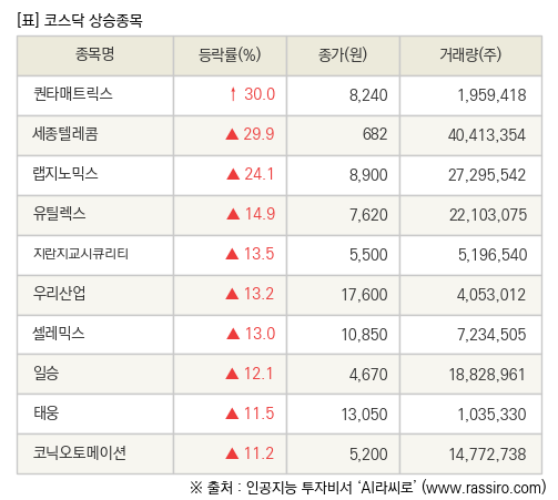 [fnRASSI]장마감, 코스닥 상승 종목(퀀타매트릭스 30.0% ↑)