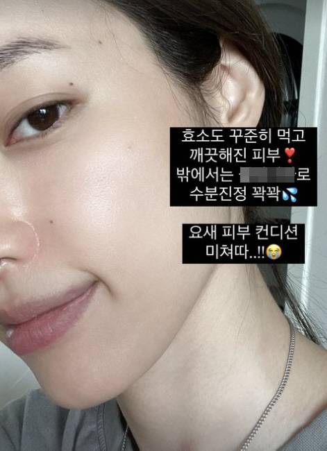 유깻잎은 19일 자신의 인스타그램 스토리에 "효소도 꾸준히 먹고 깨끗해진 피부 밖에서는 수분진정 꽉꽉. 요새 피부 컨디션 미쳤다"라며 사진을 게재했다.