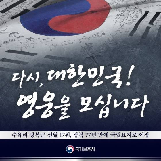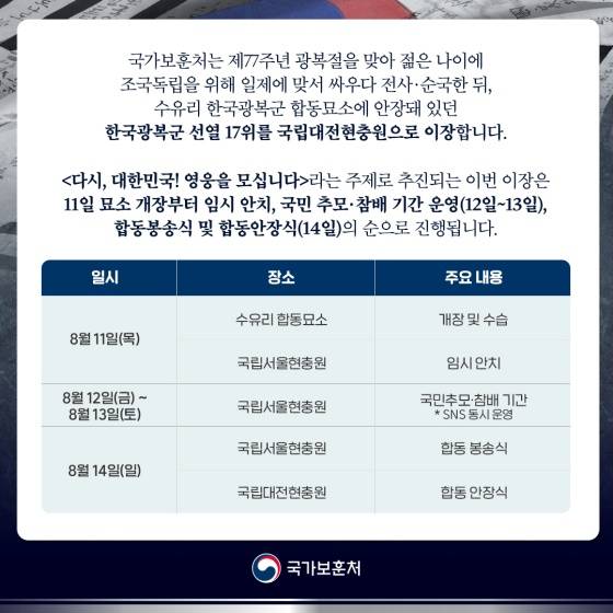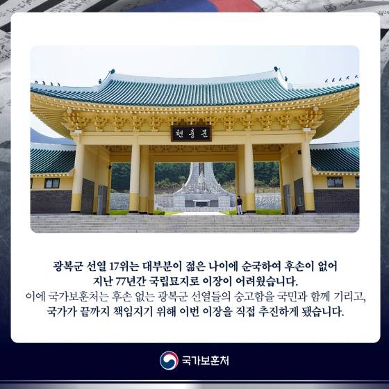 국가보훈처는 제77주년 광복절을 맞아 젊은 나이에 조국 독립을 위해 일제에 맞서 싸우다 전사·순국한 뒤, 수유리 한국광복군 합동 묘소에 안장돼 있던 한국광복군 선열 17위를 국립대전현충원으로 이장합니다.