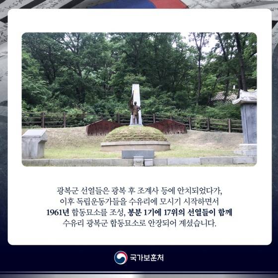 광복군 선열들은 광복 후 조계사 등에 안치되었다가, 이후 독립운동가들을 수유리에 모시기 시작하면서 1961년 합동 묘소를 조성, 봉분 1기에 17위의 선열들이 함께 수유리 광복군 합동 묘소로 안장되어 계셨습니다.