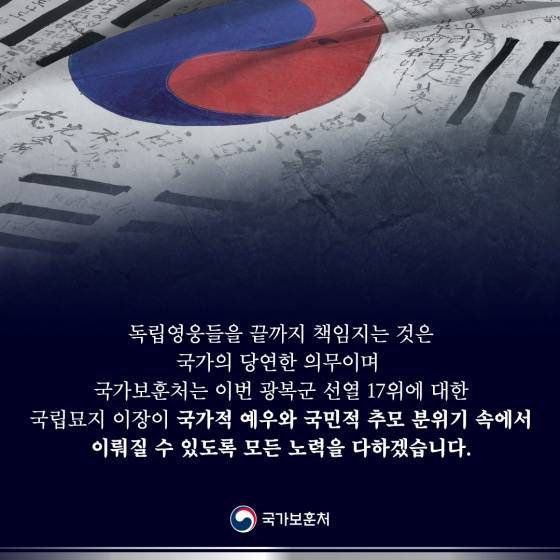 독립영웅들을 끝까지 책임지는 것은 국가의 당연한 의무이며 국가보훈처는 이번 광복군 선열 17위에 대한 국립묘지 이장이 국가적 예우와 국민적 추모 분위기 속에서 이뤄질 수 있도록 모든 노력을 다하겠습니다.