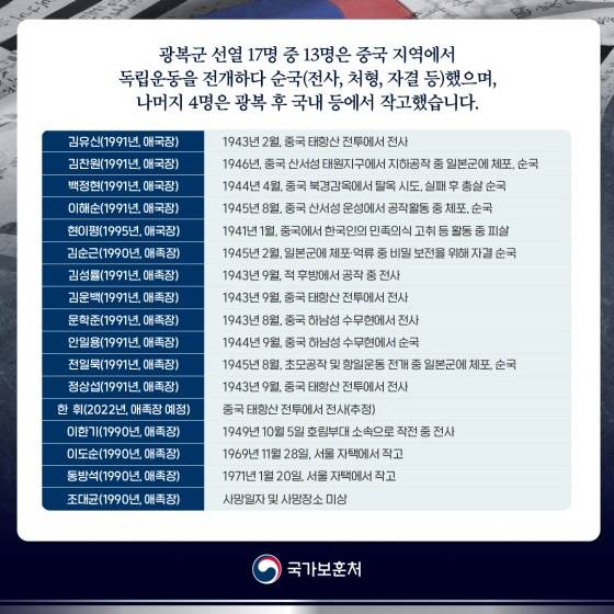 · 김유신(1991년, 애국장) : 1943년 2월, 중국 태항산 전투에서 전사 · 김찬원(1991년, 애국장) : 1946년, 중국 산서성 태원지구에서 지하공작 중 일본군에 체포, 순국 · 백정현(1991년, 애국장) : 1944년 4월, 중국 북경 감옥에서 탈옥 시도, 실패 후 총살 순국 · 이해순(1991년, 애국장) : 1945년 8월, 중국 산서성 운성에서 공작활동 중 체포, 순국 · 현이평(1995년, 애국장) : 1941년 1월, 중국에서 한국인의 민족의식 고취 등 활동 중 피살 · 김순근(1990년, 애족장) : 1945년 2월, 일본군에 체포 억류 중 비밀 보전을 위해 자결 순국 · 김성률(1991년, 애족장) : 1943년 9월, 적 후방에서 공작 중 전사 · 김운백(1991년, 애족장) : 1943년 9월, 중국 태항산 전투에서 전사 · 문학준(1991년, 애족장) : 1943년 8월, 중국 하남성 수무현에서 전사 · 안일용(1991년, 애족장) : 1944년 9월, 중국 하남성 수무현에서 순국 · 전일북(1991년, 애족장) : 1945년 8월, 초모공작 및 항일운동 전개 중 일본군에 체포, 순국 · 정상섭(1991년, 애족장) : 1943년 9월, 중국 태항산 전투에서 전사 · 한 휘(2022년, 애족장 예정) : 중국 태항산 전투에서 전사(추정) · 이한기 (1990년, 애족장) : 1949년 10월 5일 호림부대 소속으로 작전 중 전사 · 이도순(1990년, 애족장) : 1969년 11월 28일, 서울 자택에서 작고 · 동방석(1990년, 애족장) : 1971년 1월 20일, 서울 자택에서 작고 · 조대균(1990년, 애족장) : 사망 일자 및 사망 장소 미상 독립영웅들을 끝까지 책임지는 것은 국가의 당연한 의무이며 국가보훈처는 이번 광복군 선열 17위에 대한 국립묘지 이장이 국가적 예우와 국민적 추모 분위기 속에서 이뤄질 수 있도록 모든 노력을 다하겠습니다.