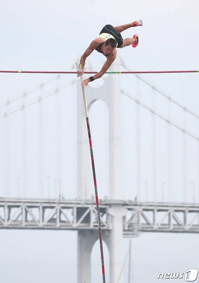 (부산=뉴스1) 김영훈 기자 = 19일 부산 수영구 광안리해수욕장 광안해변공원에서 열린 '2022부산국제장대높이뛰기대회' 에서 루이 키타다 선수가 힘차게 뛰어오르고 있다. 2022.8.19/뉴스1