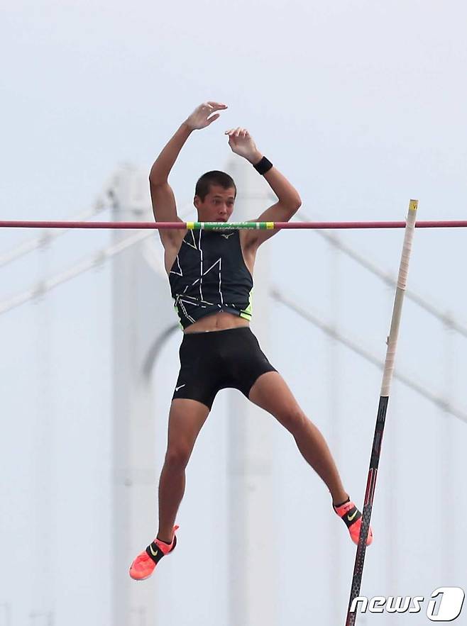 (부산=뉴스1) 김영훈 기자 = 19일 부산 수영구 광안리해수욕장 광안해변공원에서 열린 '2022부산국제장대높이뛰기대회' 에서 루이 키타다 선수가 힘차게 뛰어오르고 있다. 2022.8.19/뉴스1