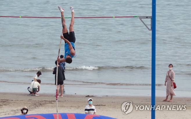 (부산=연합뉴스) 손형주 기자 = 19일 부산 수영구 광안리해수욕장에서 열린 부산 국제장대높이뛰기 U-20 부문에 출전한 이란의 야미라르샤 모사데기가 바를 넘고 있다. 2022.8.19