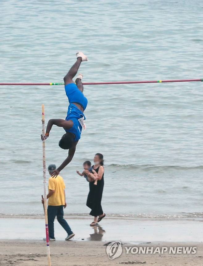 (부산=연합뉴스) 손형주 기자 = 19일 부산 수영구 광안리해수욕장에서 열린 부산 국제장대높이뛰기 U-20 부문에 출전한 인도의 삭티 라자고팔이 2차시기에 도전하고 있다. 2022.8.19